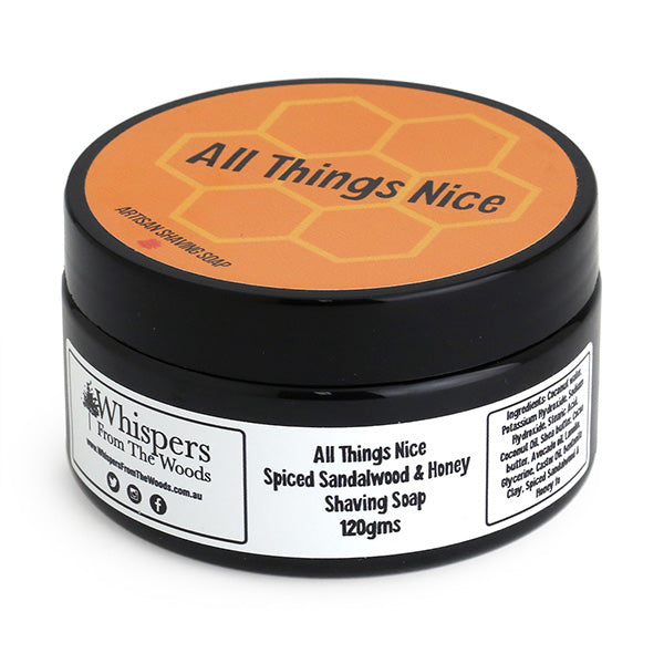 Our All Things Nice shaving soap has a wonderful sweet spiced sandalwood and honey scent invoking a sense of sweetness and sacredness. As a result our All Things Nice shaving soap has a combination that is a little spicy and very soothing.