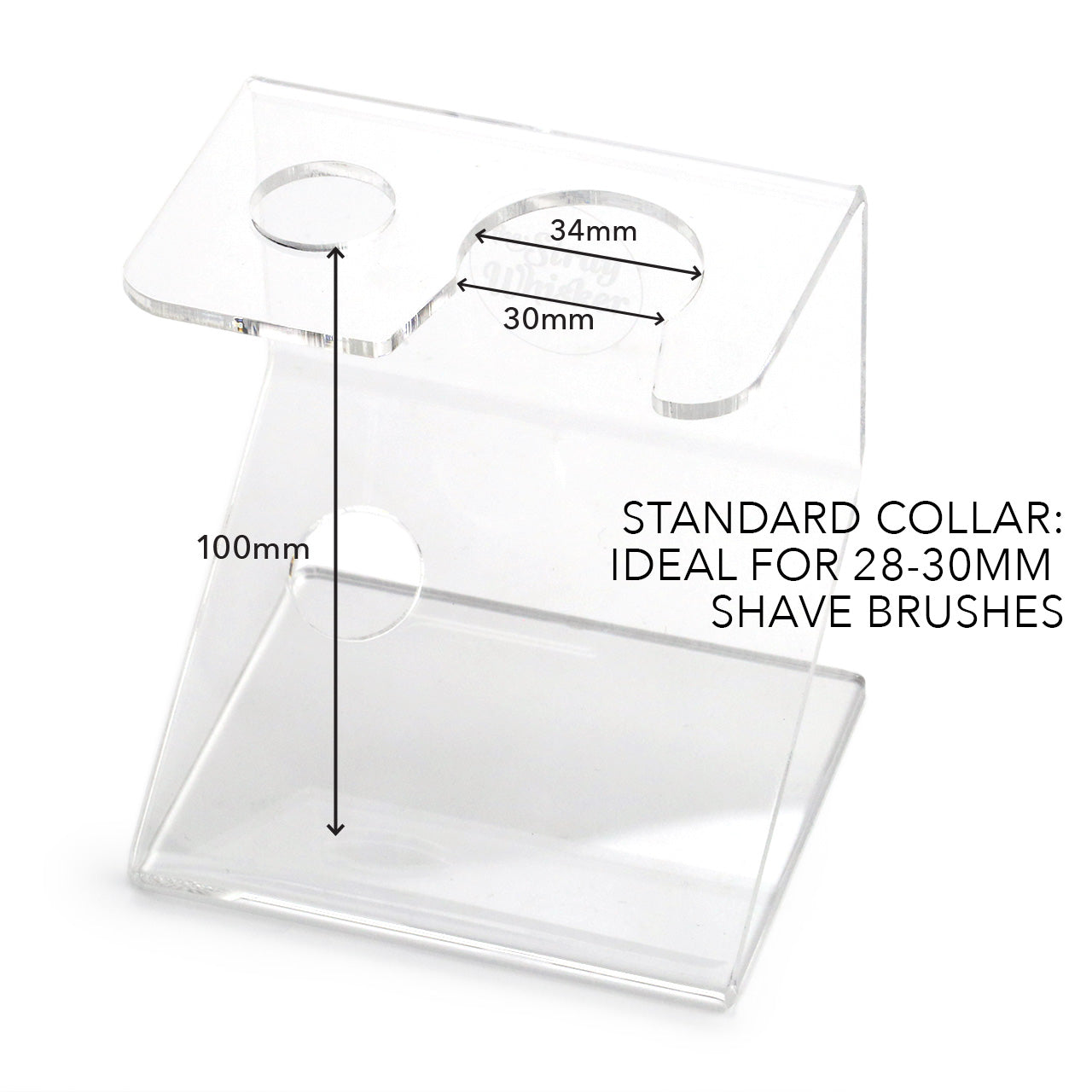 This brush and razor stand is an ideal way to store your brush and razor. The stand is made from perspex. This stand is very easy to clean. The brush and razor stand suits the bigger neck brushes as the collar is wide. However, there is an insert clip that comes with the stand. This insert once clipped on will allow the brush component of the stand to take a smaller brush handle size.